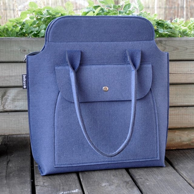 Klasyczna, pojemna i funkcjonalna torba. Zaprojektowana i uszyta z granatowego, grubego i sztywnego filcu jednostronnie impregnowanego. Elementy torebki wycięte laserowo. Na przodzie torby duża kieszonka z klapką na nap. Wewnątrz dwie kieszonki. Torebka zamykana na zamek. Całość jest sztywna.