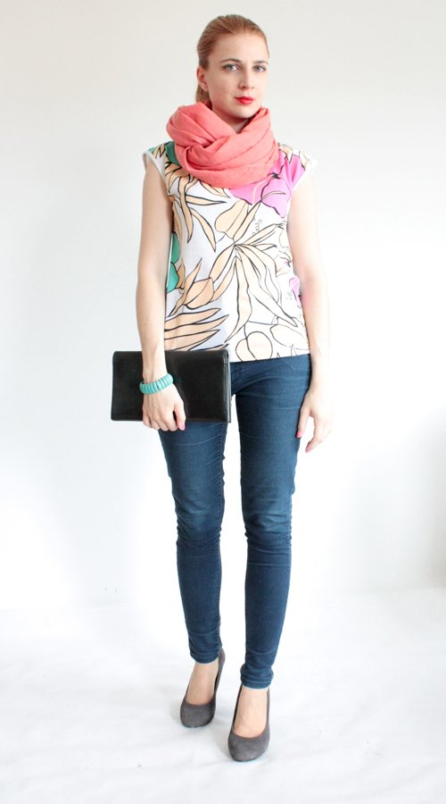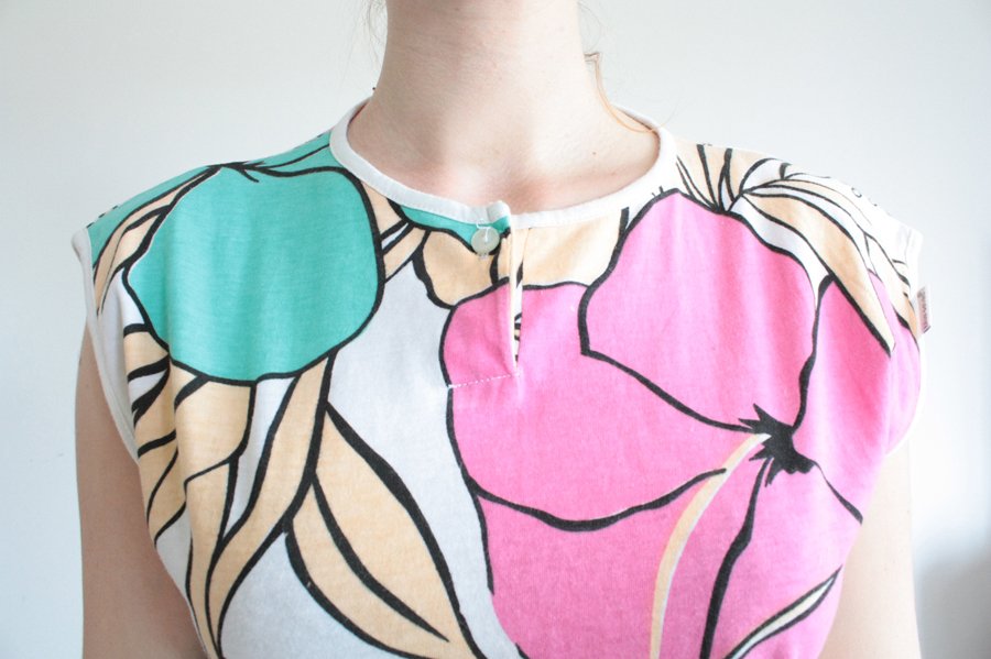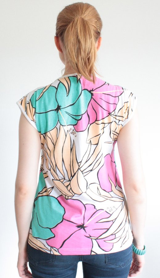 Oryginalny top w kwiatowe wzory w pięknych, letnich kolorach. Materiał to prawdopodobnie bawełna.