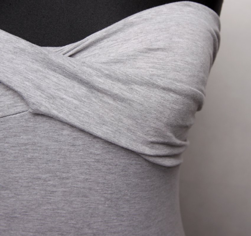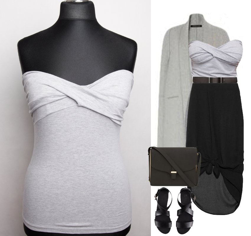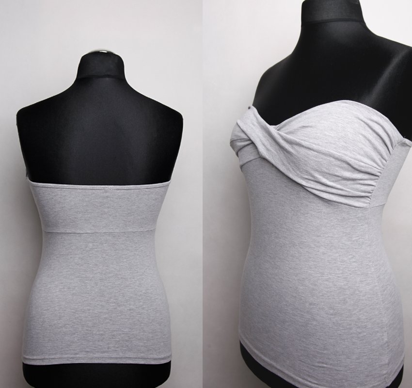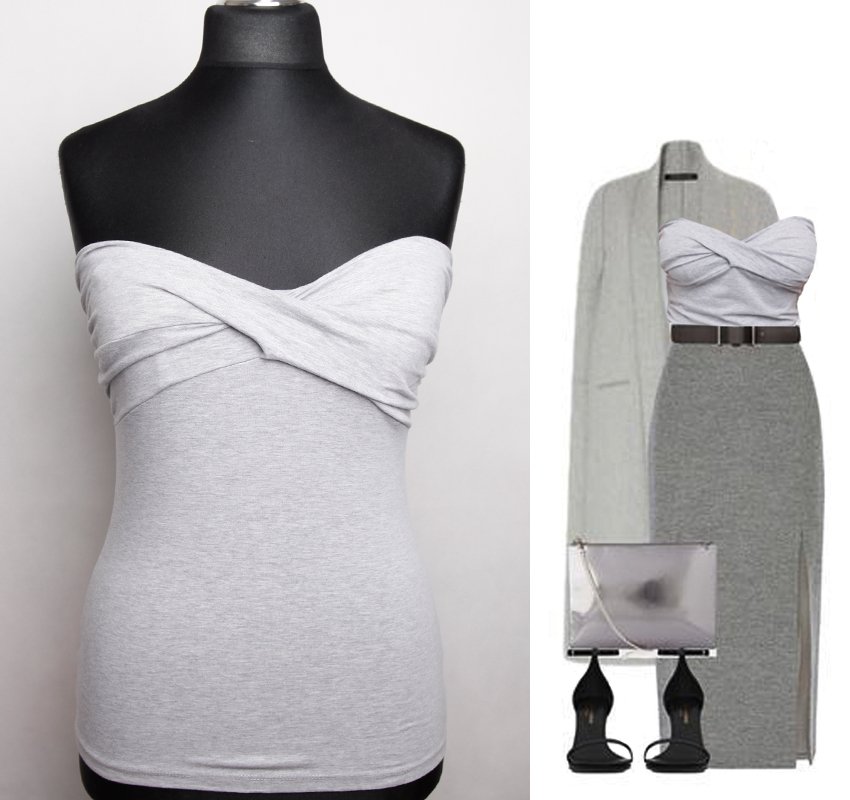 Top / bluzka tuba, z odkrytymi ramionami, w kolorze szary melanż. Biust delikatnie wzmocniony miseczkami, tył ściągnięty na gumce. Idealna na lato, do stroju plażowego, długiej spódnicy, można połączyć z biustonoszem typu straps. W zestawie odpinane ramiączka.