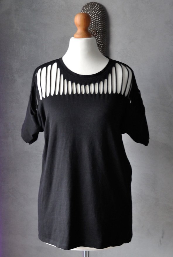 Uszyty z czarnej, niezbyt grubej bawełny. Z krótkim rękawem. Na wysokości ramion i łopatek z przodu i z tyłu rozcięcia. Pięknie eksponują ramiona.