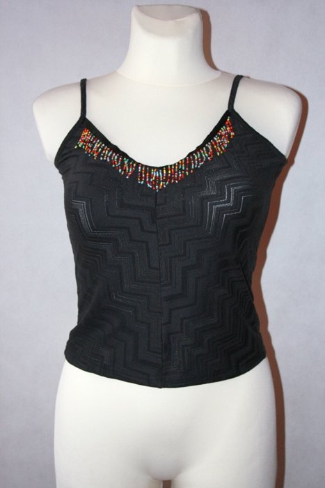 krótki czarny top na ramiączkach z ozdobnymi koralikami przy dekolcie, materiał lekko prześwitujący w oryginalne wzory, brak metki ze składem i rozmiarem