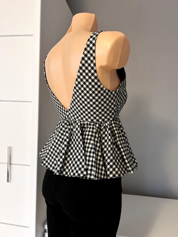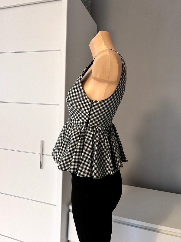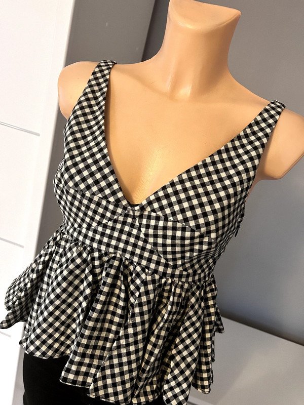 Top Zara 100 % bawełna, rozmiar z metki XS 34, ale według mnie to rozmiar XXS 32 - proszę sugerować się wymiarami poniżej. Czarno- biała drobna krateczka, na podszewce z bawełny, gorsetowa góra, grube ramiączka, dekolt v z przodu i z tyłu. Z boku zasuwana na zamek. Dopasowany w pasie kobiecy fason z falbaną podkreślający talię. Klasyka, szafa kapsułowa, old money style. Polecam
