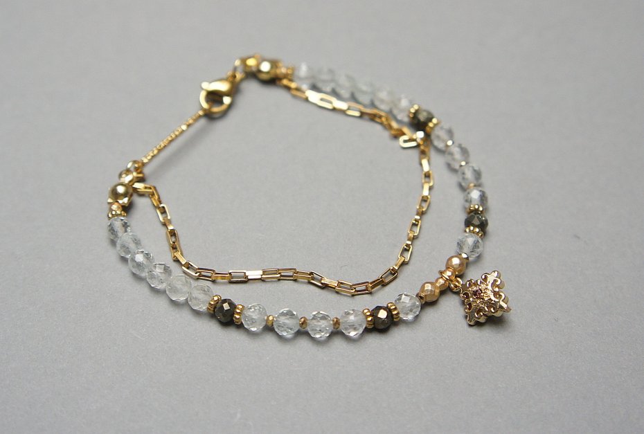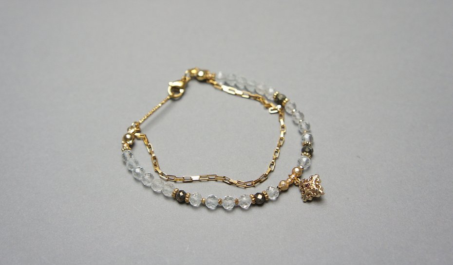 Delikatna bransoletka wykonana w całości ze stali szlachetnej pozłacanej oraz naturalnych, szlachetnych kamieni - fasetowany topaz [4mm], fasetowany piryt o surowym wyglądzie [3mm], hematyt fasetowany, platerowany o matowej powłoce [2mm i 3mm], zawieszki z mosiądzu platerowanego z cyrkonią.