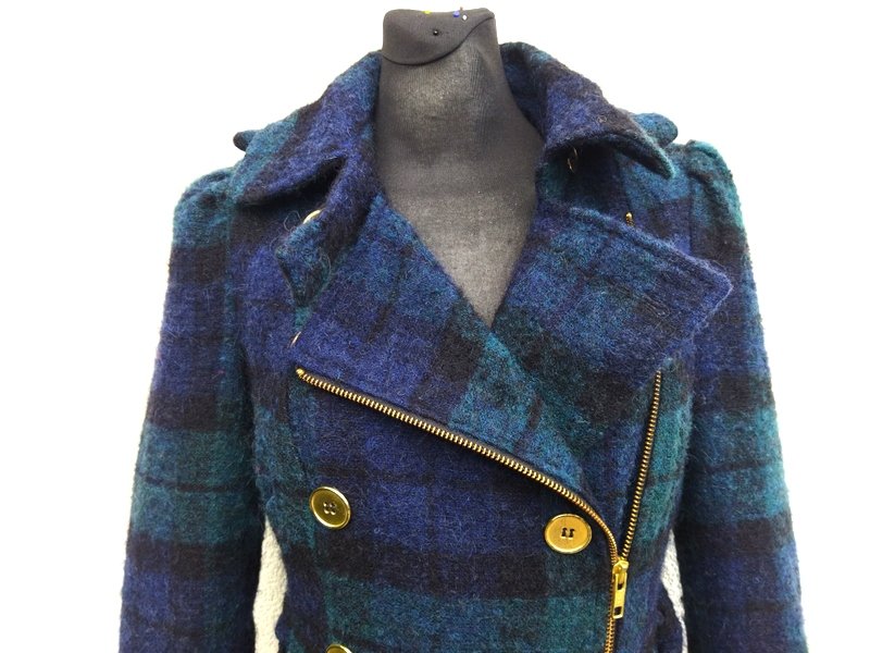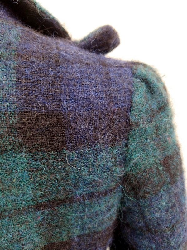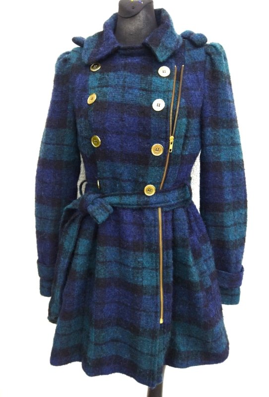 Urokliwy płaszcz ze świetnej jakości jakości tkaniny w kratę w kolorystyce morskiej zieleni, czerni i granatu. Odcinany w pasie góra dopasowana z kołnierzem, z kokardkami na ramionach, talia podkreślona paskiem wszytym z tyłu z dwiema naszywanymi kokardkami i wiązanym z przodu, dół rozkloszowany zakładkami . Dwie wpuszczane kieszenie, patki na mankietach rękawów. Zapinany asymetrycznie na zamek, dwurzędowo naszywane guziki pełnia role ozdobną, zamek i guziki w złotym kolorze. Całość na podszewce.
