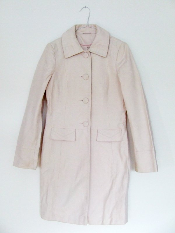 Piękny bladoróżowy trencz z kołnierzykiem w stylu retro. Zapinany z przodu na guziki, z przodu atrapy kieszonek. Płaszczyk posiada podszewkę, jest cienki, idealny na wiosnę.