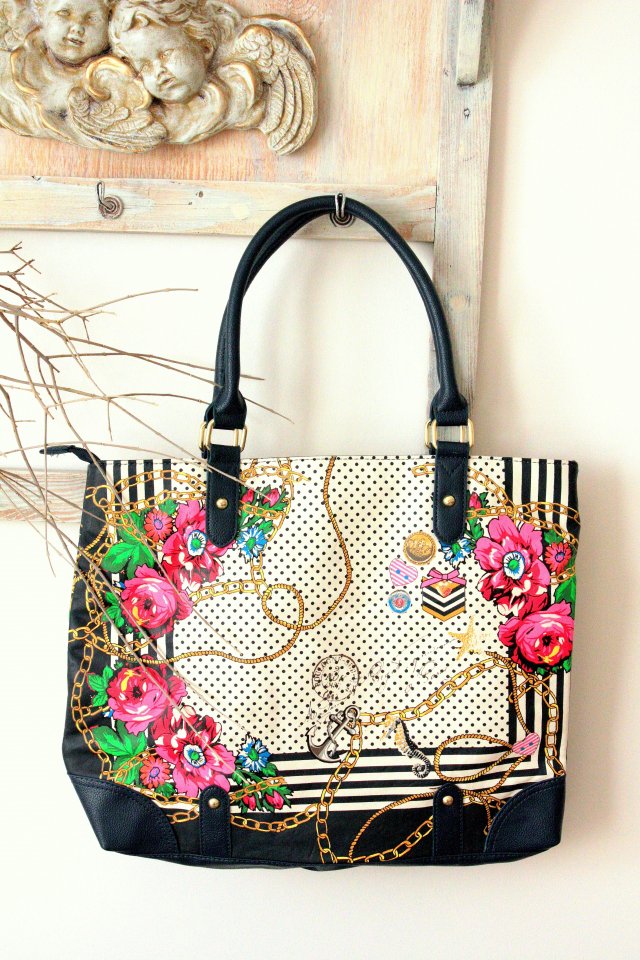 Fajna duża torba w kolorze biało - granatowym. Z różami. Zapinana na zamek.