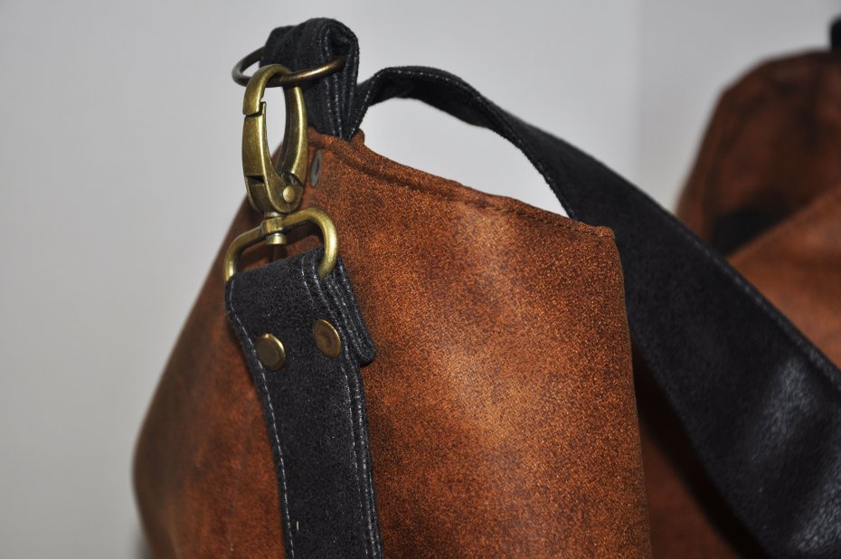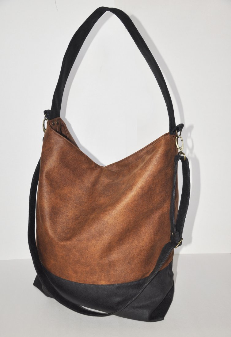 Pojemna torba wykonana z koniakowego syntetycznego nubuku w połączeniu z ciemnobrązowym.