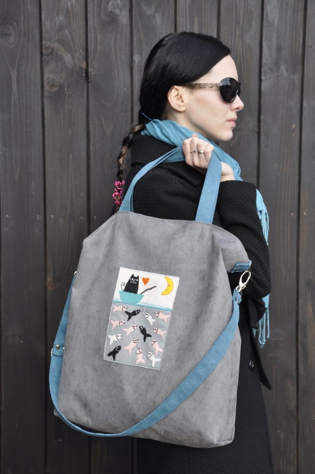 Przepastna torba z aplikacją wyszywaną ręcznie - kot na rybach