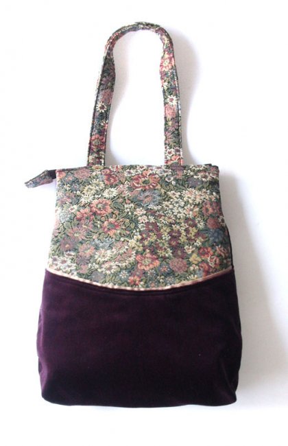 Torba na ramię z aksamitu w kolorze oberżyny oraz żakardu w kwiaty (przód); nieusztywniana. W środku podszewka pikowana na ocieplinie (fioletowa) i 2 kieszenie. Zamykana na suwak Szer. 33-38 cm; wys. 40 cm; rączki 60 cm. Mieści format A4.