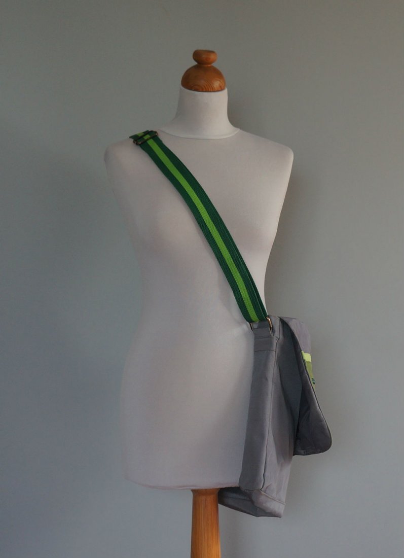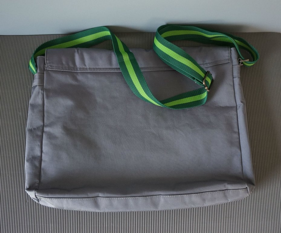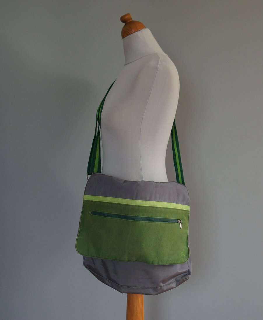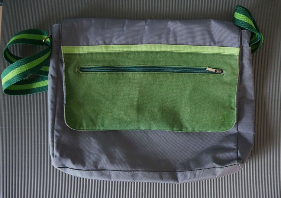 Torba na ramię. Pomieści laptop. Cała na podszewce. W środku materiałowa przegroda. Zamykana na rzep. Z przodu wpuszczona kieszeń, zamykana na suwak. Szeroki pasek na ramię z możliwością regulacji długości. Stan dobry+.