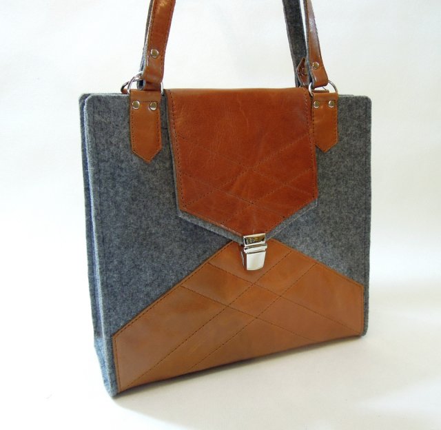 Torebka została wykonana z impregnowanego filcu technicznego w kolorze szarym. Elementy ozdobne torebki są wykonane z naturalnej skóry bydlęcej w kolorze rudym i czarnym. Prosta, minimalistyczna forma. Torebka jest starannie wykonana, wygląda naprawdę ładnie! Maksymalna szerokość torebki - 39 cm, wysokość - 42 cm. Została wykonana z dbałością o każdy szczegół. Zapinana na metalowy guzik w kolorze srebrnym. W środku znajduje się kieszonka na telefon, a z tyłu torebki jest naszyta duża kieszonka zapinana na suwak. Torebka jest pojemna - mieści format A4 pionowo i poziomo. Gorąco polecam!