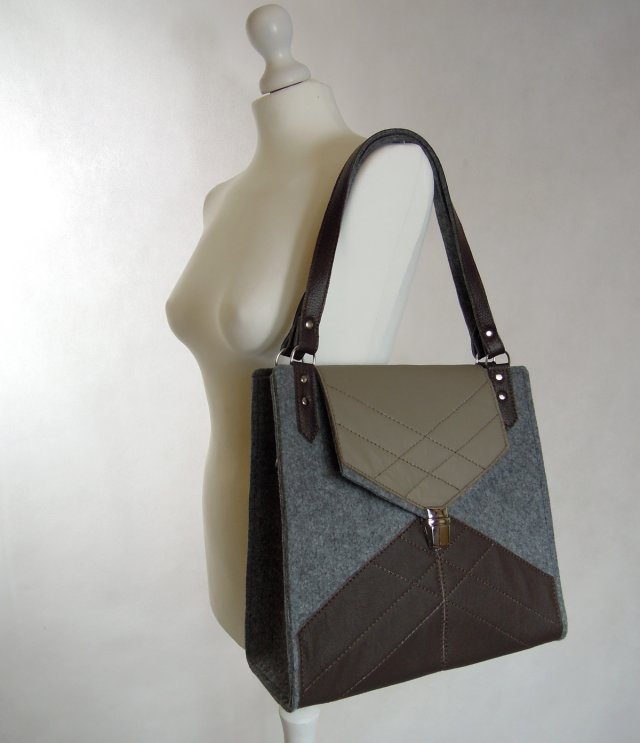 Torebka została wykonana z impregnowanego filcu technicznego w kolorze szarym. Elementy ozdobne torebki są wykonane z naturalnej skóry bydlęcej w kolorze brązowym i beżowym. Prosta, minimalistyczna forma. Torebka jest starannie wykonana, wygląda naprawdę ładnie! Maksymalna szerokość torebki - 32 cm, wysokość - 31 cm, głębokość max 12 cm. Została wykonana z dbałością o każdy szczegół. Zapinana na metalową klamrę w kolorze srebrnym. W środku znajdują się kieszonka na telefon ii duża kieszonka zapinana na suwak. Do torebki dołączony jest wzmocniony, odpinany pasek z regulatorem długości, długość maksymalna - 145 cm. Gorąco polecam!