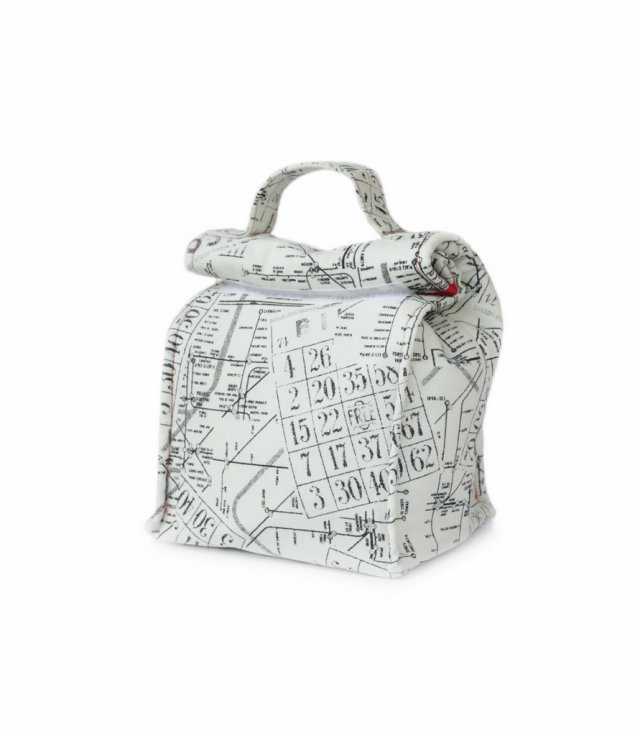 Wierzchnia tkanina to bawełna z motywem kart bingo. Podszewka jest bawełniana w kolorze czerwonym. W środku dodatkowo posiada warstwę termoizolacyjną - trzymającą temperaturę. Dno posiada dodatkowe usztywnienie. Krawędzie przeszyte, żeby torba lepiej trzymała kształt. Posiada rączkę ułatwiająca noszenie. Zamykana na rzepy.