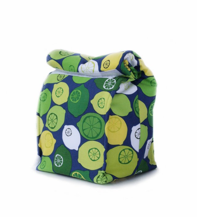 Wierzchnia tkanina to granatowa bawełna z motywem cytrusów. Podszewka jest bawełniana w kolorze limonkowym. W środku dodatkowo posiada warstwę termoizolacyjną - trzymającą temperaturę. Dno posiada dodatkowe usztywnienie. Krawędzie przeszyte, żeby torba lepiej trzymała kształt. Zamykana na rzepy ( jeden szeroki, daje kilka cm regulacji).