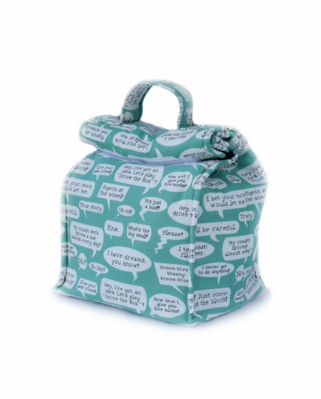 Wierzchnia tkanina to morska bawełna z motywem dymków z tekstem. Podszewka jest bawełniana w kolorze czarnym. W środku dodatkowo posiada warstwę termoizolacyjną - trzymającą temperaturę. Dno posiada dodatkowe usztywnienie. Krawędzie przeszyte, żeby torba lepiej trzymała kształt. Posiada rączkę ułatwiająca noszenie. Zamykana na rzepy.