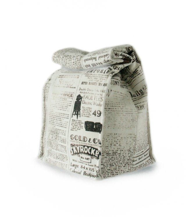 Torba jest uszyta z bawełny. Wierzchnia tkanina to wzór starej gazety w kolorze kremowym z ciemnobrązowym drukiem. Podszewka jest w kolorze ciemnobrązowym. W środku dodatkowo posiada warstwę termoizolacyjną - trzymającą temperaturę oraz warstwę nieprzemakalną. Dno posiada dodatkowe usztywnienie. Krawędzie przeszyte, żeby torba lepiej trzymała kształt. Zamykana na rzepy ( jeden szeroki, daje kilka cm regulacji).