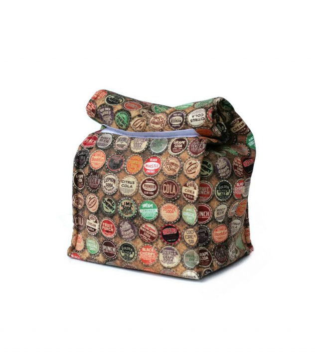 Torba jest uszyta z bawełny. Wierzchnia tkanina to motyw kapsli. Podszewka jest w kolorze brązowym. W środku dodatkowo posiada warstwę termoizolacyjną - trzymającą temperaturę. Dno posiada dodatkowe usztywnienie. Krawędzie przeszyte, żeby torba lepiej trzymała kształt. Zamykana na rzepy ( jeden szeroki, daje kilka cm regulacji). Można prać w pralce w 30st.