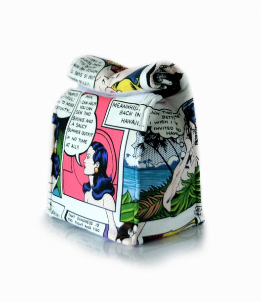 Wierzchnia tkanina to bawełna z motywem komiksu. Podszewka jest bawełniana w kolorze czarnym.. W środku dodatkowo posiada warstwę termoizolacyjną - trzymającą temperaturę oraz warstwę nieprzemakalną. Dno posiada dodatkowe usztywnienie. Krawędzie przeszyte, żeby torba lepiej trzymała kształt. Zamykana na rzepy ( jeden szeroki, daje kilka cm regulacji).