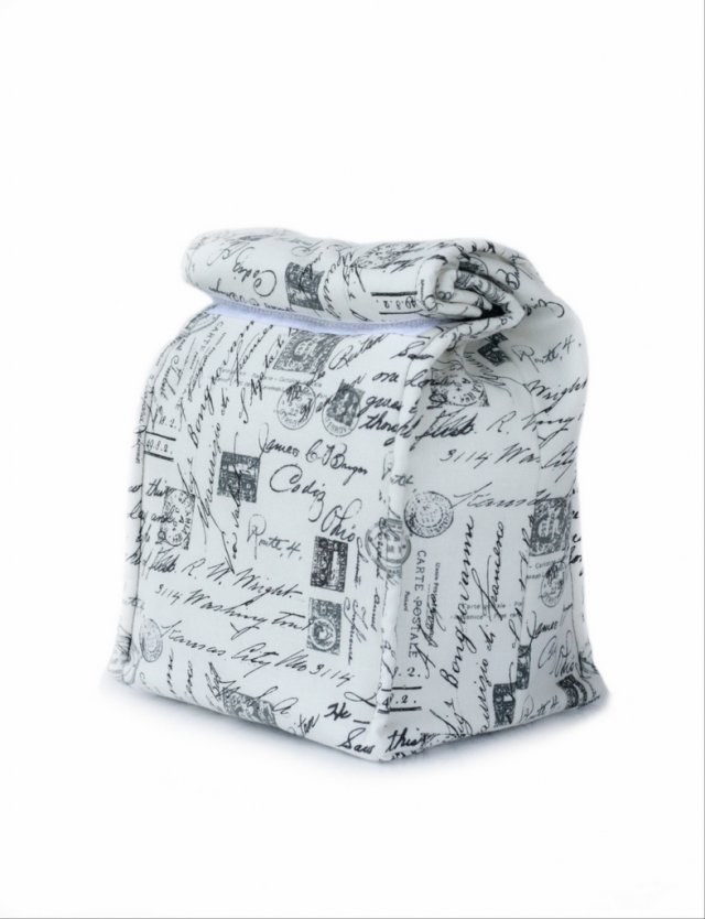 Wierzchnia tkanina to granatowa bawełna z motywem listów i znaczków. Podszewka jest bawełniana w kolorze carnym. W środku dodatkowo posiada warstwę termoizolacyjną - trzymającą temperaturę. Dno posiada dodatkowe usztywnienie. Krawędzie przeszyte, żeby torba lepiej trzymała kształt. Zamykana na rzepy ( jeden szeroki, daje kilka cm regulacji).