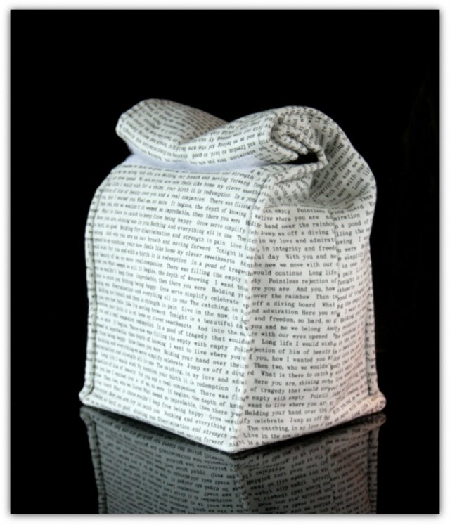 Wierzchnia tkanina to bawełna z motywem maszynopisu Podszewka jest bawełniana w kolorze czarnym. W środku dodatkowo posiada warstwę termoizolacyjną - trzymającą temperaturę oraz warstwę nieprzemakalną. Dno posiada dodatkowe usztywnienie. Krawędzie przeszyte, żeby torba lepiej trzymała kształt. Zamykana na rzepy ( jeden szeroki, daje kilka cm regulacji).