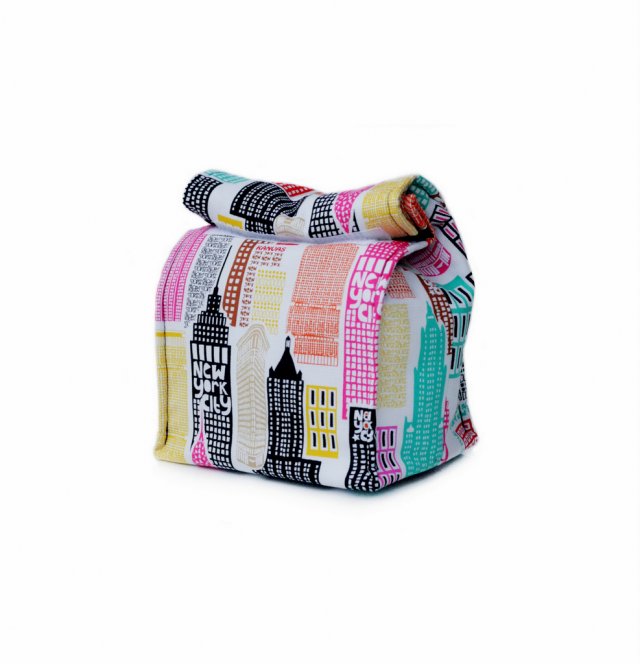 Wierzchnia tkanina to bawełna z motywem budynków Nowego Jorku. Podszewka jest bawełniana w kolorze czarnym. W środku dodatkowo posiada warstwę termoizolacyjną - trzymającą temperaturę. Dno posiada dodatkowe usztywnienie. Krawędzie przeszyte, żeby torba lepiej trzymała kształt. Zamykana na rzepy.