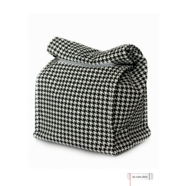 Wierzchnia tkanina to bawełna w czarno-białą pepitkę. Podszewka jest bawełniana w kolorze czarnym. W środku dodatkowo posiada warstwę termoizolacyjną - trzymającą temperaturę. Dno posiada dodatkowe usztywnienie. Krawędzie przeszyte, żeby torba lepiej trzymała kształt. Zamykana na rzepy.