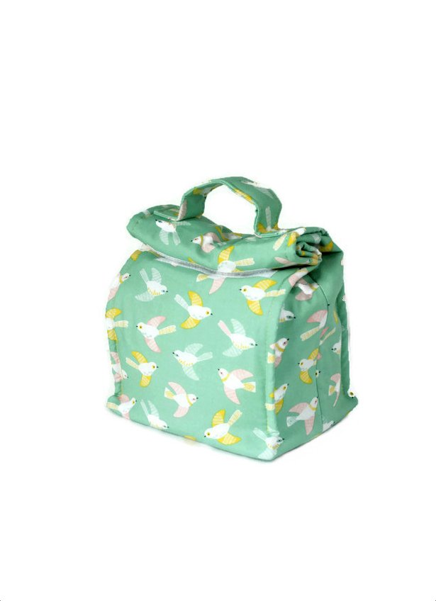 Wierzchnia tkanina to kremowa bawełna z motywem ptaszków. Podszewka jest bawełniana w kolorze jasnożółtym. W środku dodatkowo posiada warstwę termoizolacyjną - trzymającą temperaturę. Dno posiada dodatkowe usztywnienie. Krawędzie przeszyte, żeby torba lepiej trzymała kształt. Posiada rączkę ułatwiająca noszenie. Zamykana na rzepy.