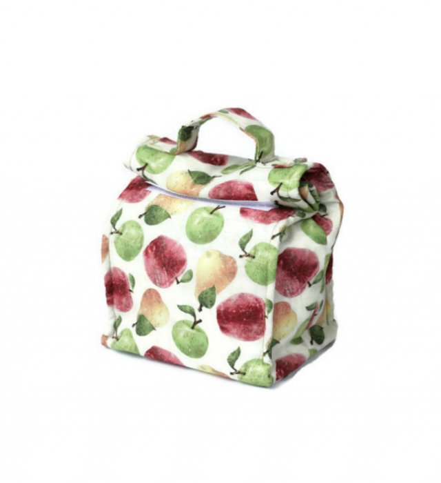Wierzchnia tkanina to bawełna z motywem z motywem owoców. Podszewka jest bawełniana w kolorze jasnozielonym. W środku dodatkowo posiada warstwę termoizolacyjną - trzymającą temperaturę. Dno posiada dodatkowe usztywnienie. Krawędzie przeszyte, żeby torba lepiej trzymała kształt. Posiada rączkę ułatwiająca noszenie. Zamykana na rzepy.