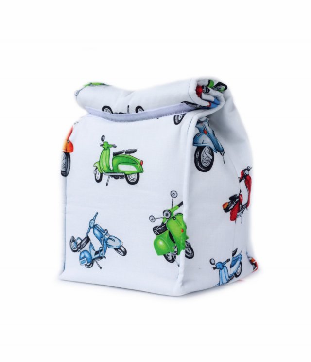 Wierzchnia tkanina to biała bawełna w kolorowe skutery. Podszewka jest bawełniana w kolorze niebieskim. W środku dodatkowo posiada warstwę termoizolacyjną - trzymającą temperaturę oraz warstwę nieprzemakalną. Dno posiada dodatkowe usztywnienie. Krawędzie przeszyte, żeby torba lepiej trzymała kształt. Zamykana na rzepy ( jeden szeroki, daje kilka cm regulacji).