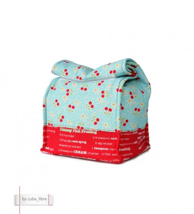 Wierzchnia tkanina to bawełna w wisienki oraz przepisy. Podszewka jest bawełniana w kolorze czerwonym. W środku dodatkowo posiada warstwę termoizolacyjną - trzymającą temperaturę. Dno posiada dodatkowe usztywnienie. Krawędzie przeszyte, żeby torba lepiej trzymała kształt. Zamykana na rzepy.
