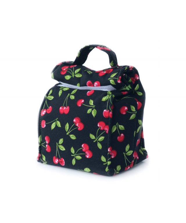 Wierzchnia tkanina to bawełna z motywem wisienek. Podszewka jest bawełniana w kolorze jasnozielonym. W środku dodatkowo posiada warstwę termoizolacyjną - trzymającą temperaturę. Dno posiada dodatkowe usztywnienie. Krawędzie przeszyte, żeby torba lepiej trzymała kształt. Posiada rączkę ułatwiająca noszenie. Zamykana na rzepy.