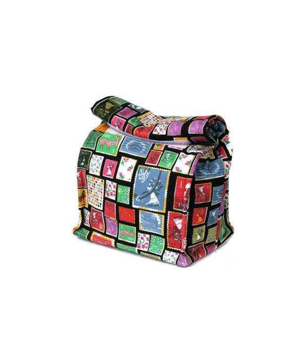 Wierzchnia tkanina to bawełna z motywem kolorowych znaczków. Podszewka jest bawełniana w kolorze zielonym. W środku dodatkowo posiada warstwę termoizolacyjną - trzymającą temperaturę. Dno posiada dodatkowe usztywnienie. Krawędzie przeszyte, żeby torba lepiej trzymała kształt. Zamykana na rzepy.