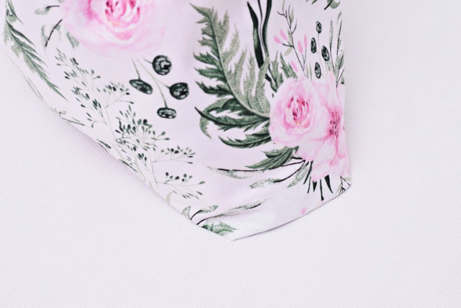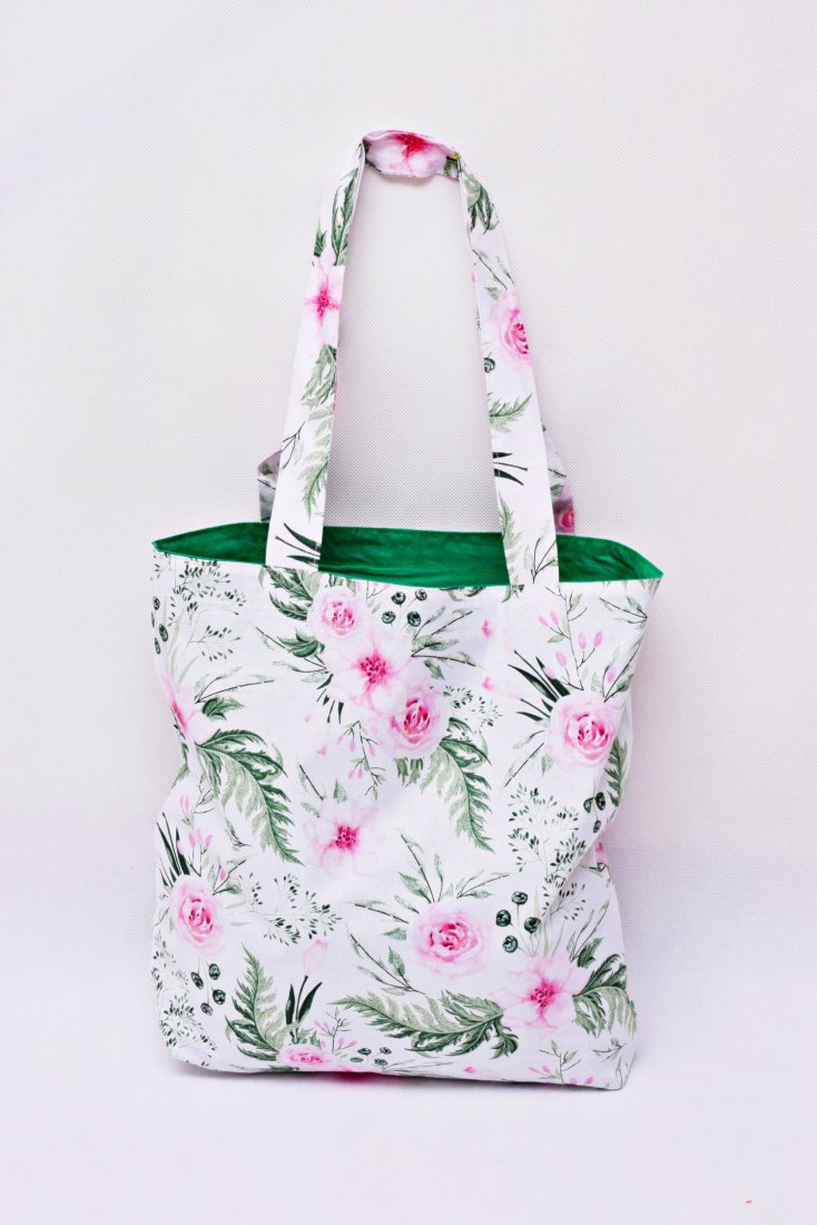 Ekologiczna torba na zakupy uszyta z bawełny 100% kwiaty in garden białe i bawełnianą zieloną podszewką.