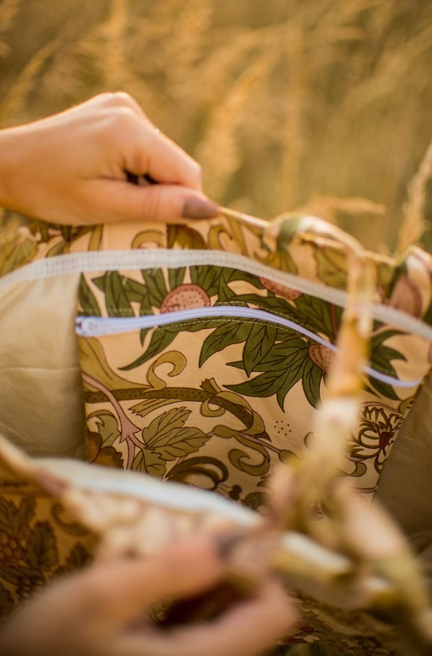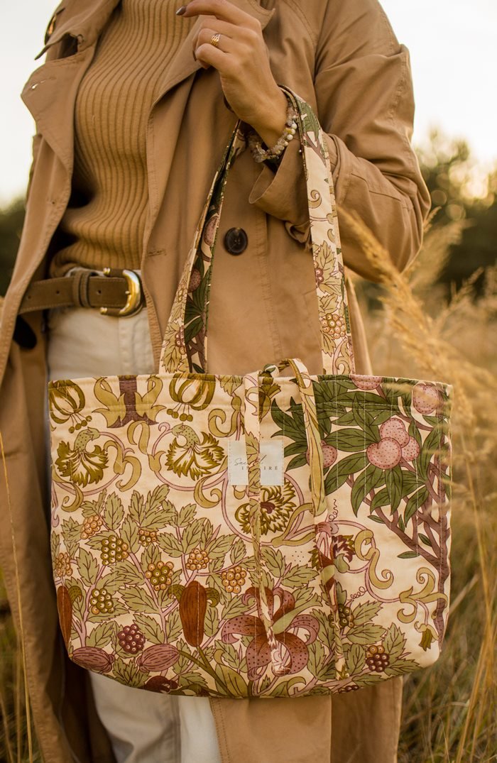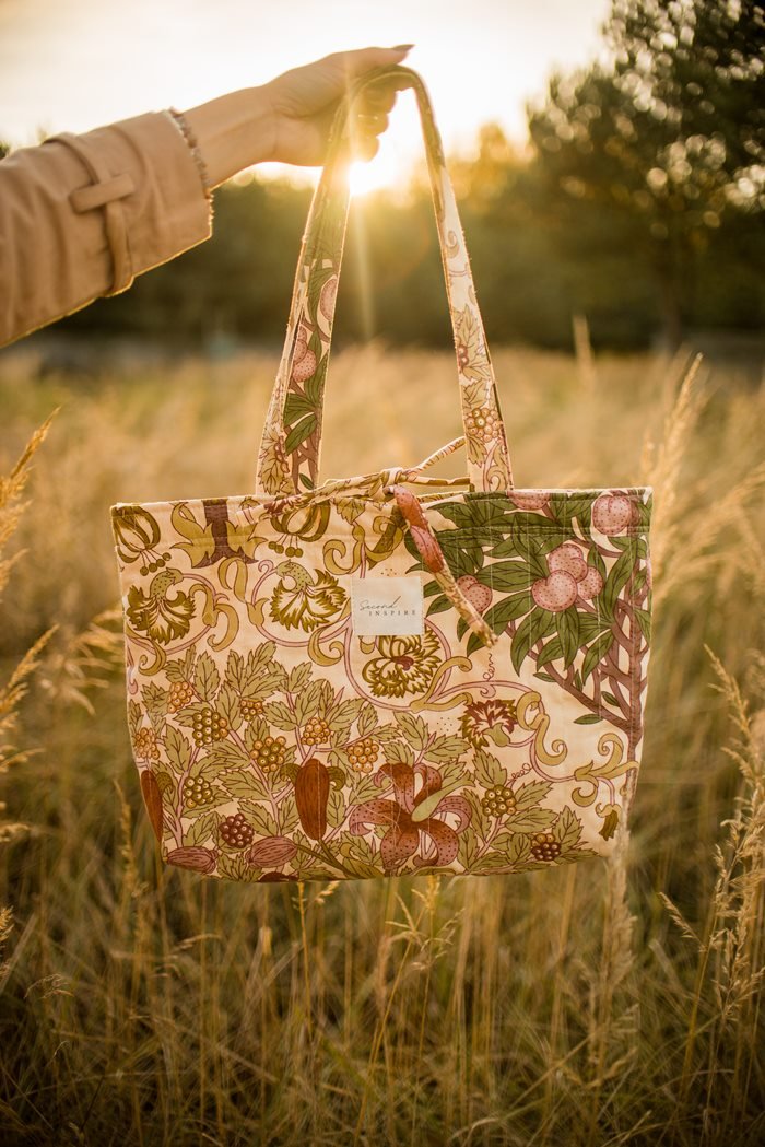 Torba ogród: z motywem drzewek i owoców oraz kwiatów, utrzymana w jesiennych barwach. Posiada wiązanie oraz z kieszonkę wewnętrzną, a także poszerzany doł. Idealna na co dzień, do szkoły lub na zakupy!
