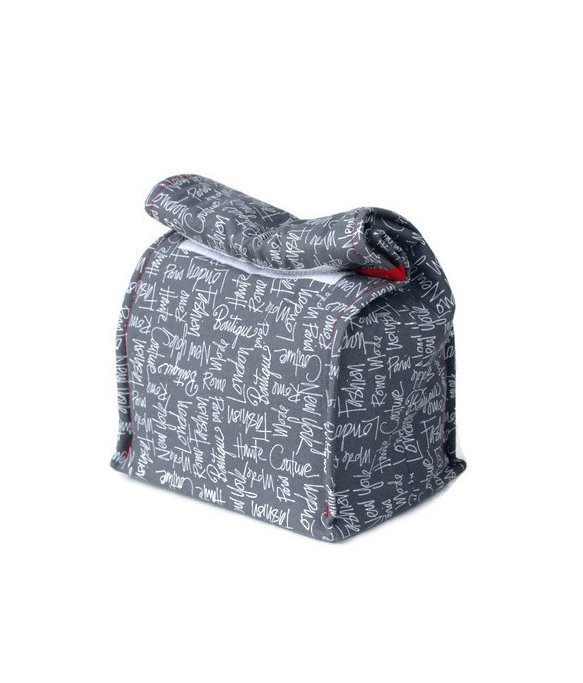Wierzchnia tkanina to bawełna z motywem napisów. Podszewka jest bawełniana w kolorze czerwonym. W środku dodatkowo posiada warstwę termoizolacyjną - trzymającą temperaturę. Dno posiada dodatkowe usztywnienie. Krawędzie przeszyte, żeby torba lepiej trzymała kształt. Zamykana na rzepy.