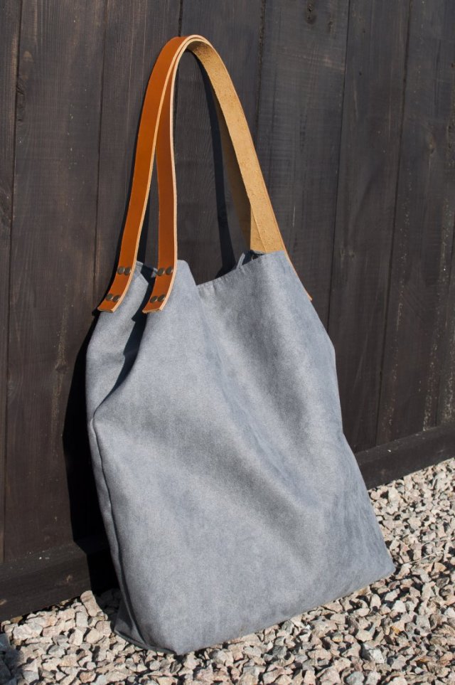 Duża torba w kształcie worka wykonana z alcantary (syntetycznego zamszu) w kolorze ciemnoszarym,