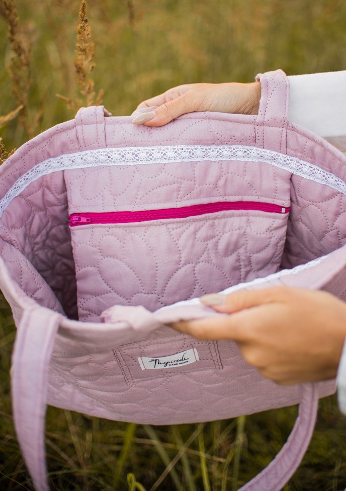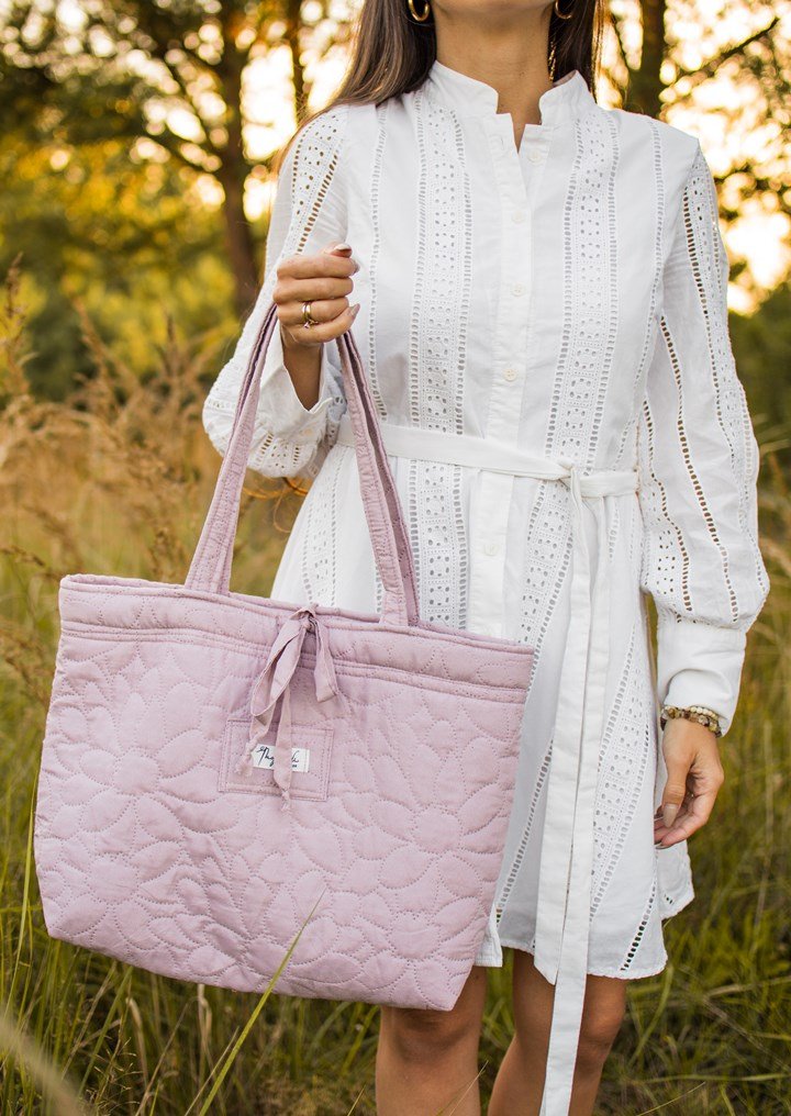 Pastelowa torba w tłoczone kwiaty, z kieszonką wewnętrzną, a także poszerzanym dołem.