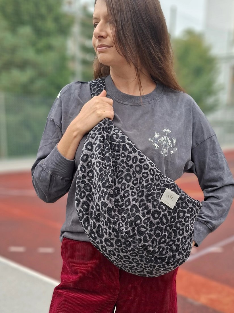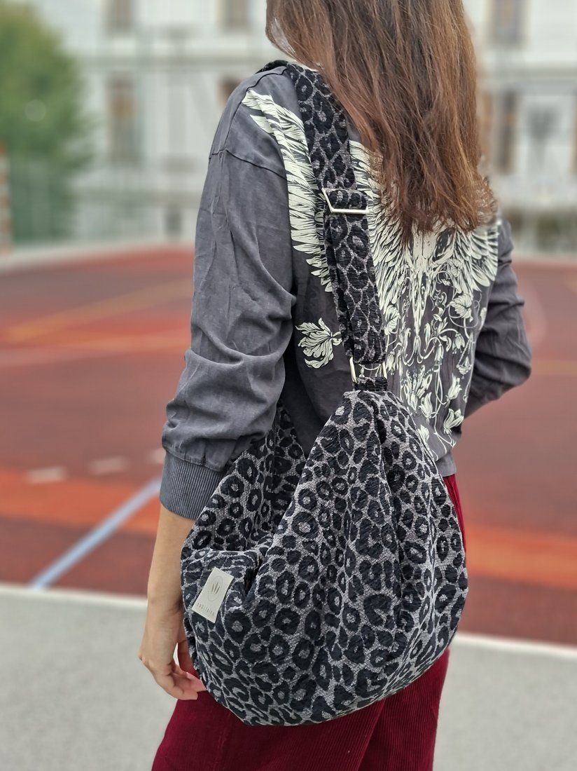 Średniej wielkości, minimalistyczna torba worek wykonana z grubej, tkanej żakardowo tkaniny z wzorem panterki.