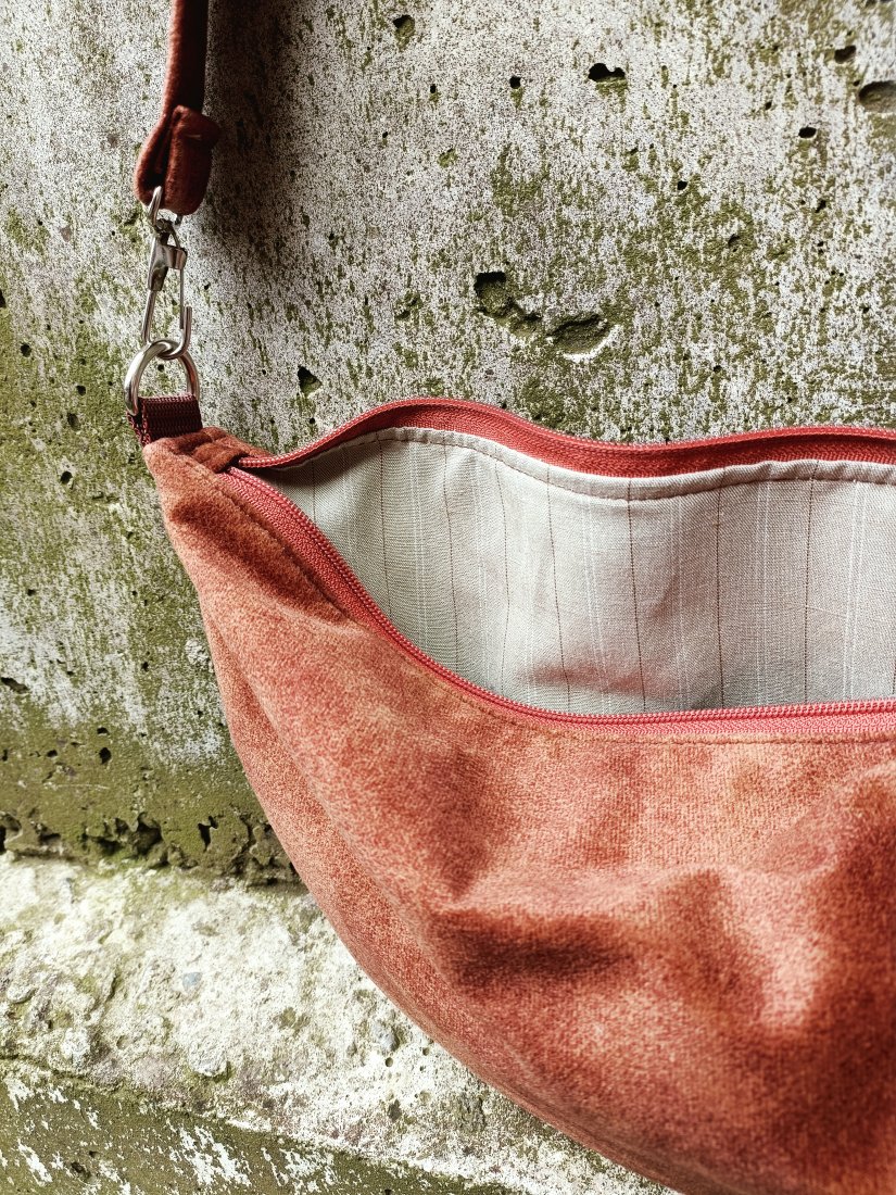 Torba z mocnej, gęstej tkaniny przypominającej zamsz. Piękna kolorystyka, wykończona podszewką lniano- bawełnianą z kieszonka na zamek.