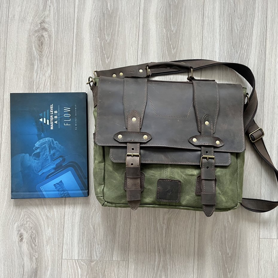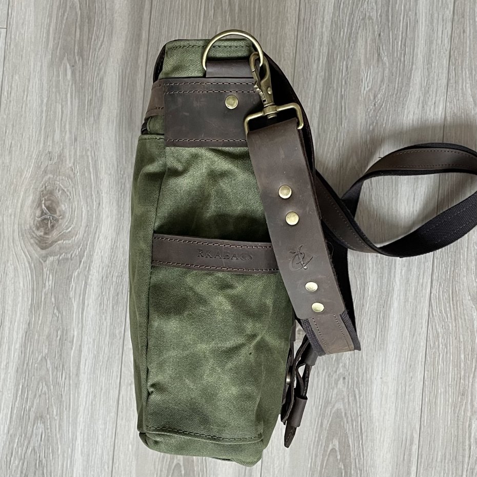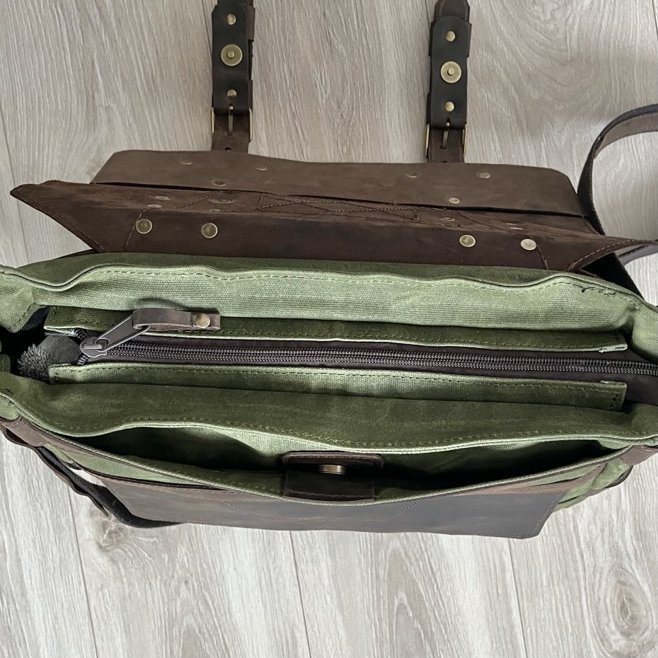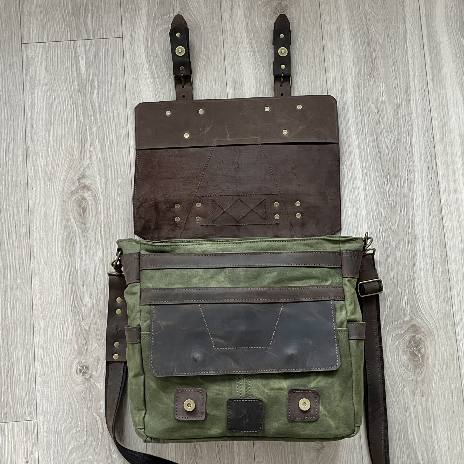 Klasyczna torba listonoszka w stylu Vintage to połączenie woskowanej bawełny Wax Cotton i skóry Crazy Horse.