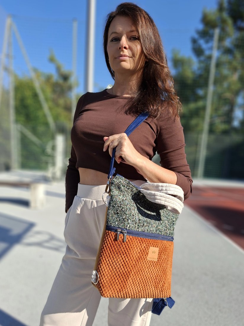 Torebko-plecak może służyć jako torebka albo jak plecak po przypięciu szelek do tyłu plecaka.