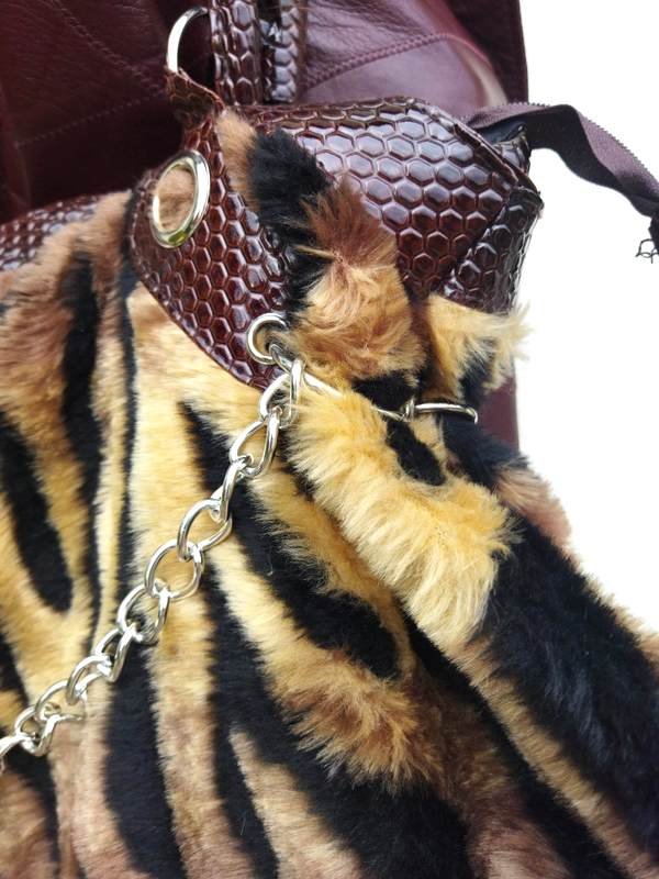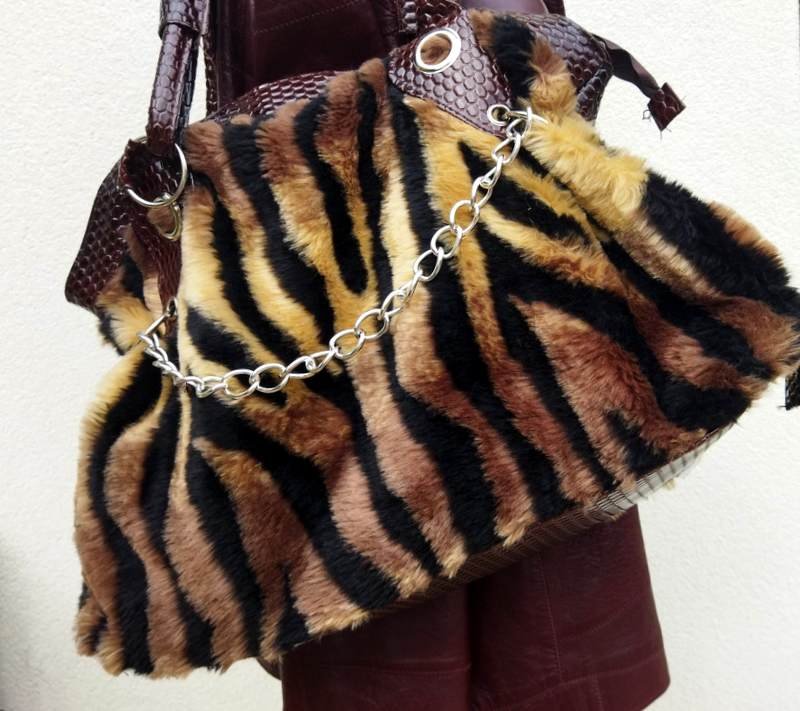 Efektowna duża torebka ze sztucznego futerka w zwierzęcy print w beżowo-czarno-brunatnej kolorystyce z elementami wykończeniowymi z mocnej skóry ekologicznej w gadzi wzór zdobiona od frontu wiszącym łańcuchem. Jednokomorowa, z podszewką z kieszonką na zamek. Zapinana od góry na zamek Długość uszu pozwala nosić ją zarówno w ręku jak i na ramieniu.