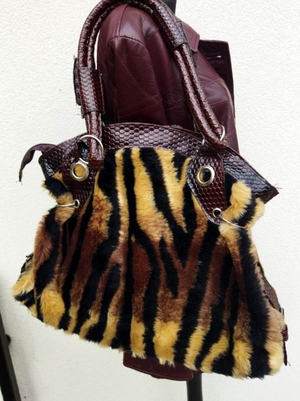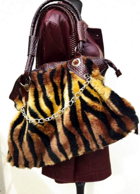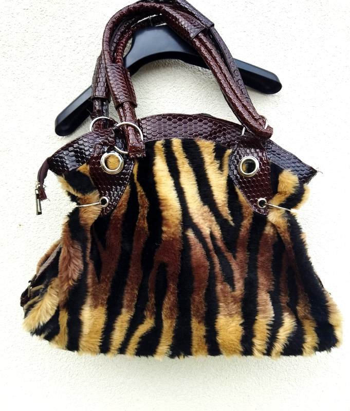Efektowna duża torebka ze sztucznego futerka w zwierzęcy print w beżowo-czarno-brunatnej kolorystyce z elementami wykończeniowymi z mocnej skóry ekologicznej w gadzi wzór zdobiona od frontu wiszącym łańcuchem. Jednokomorowa, z podszewką z kieszonką na zamek. Zapinana od góry na zamek Długość uszu pozwala nosić ją zarówno w ręku jak i na ramieniu.