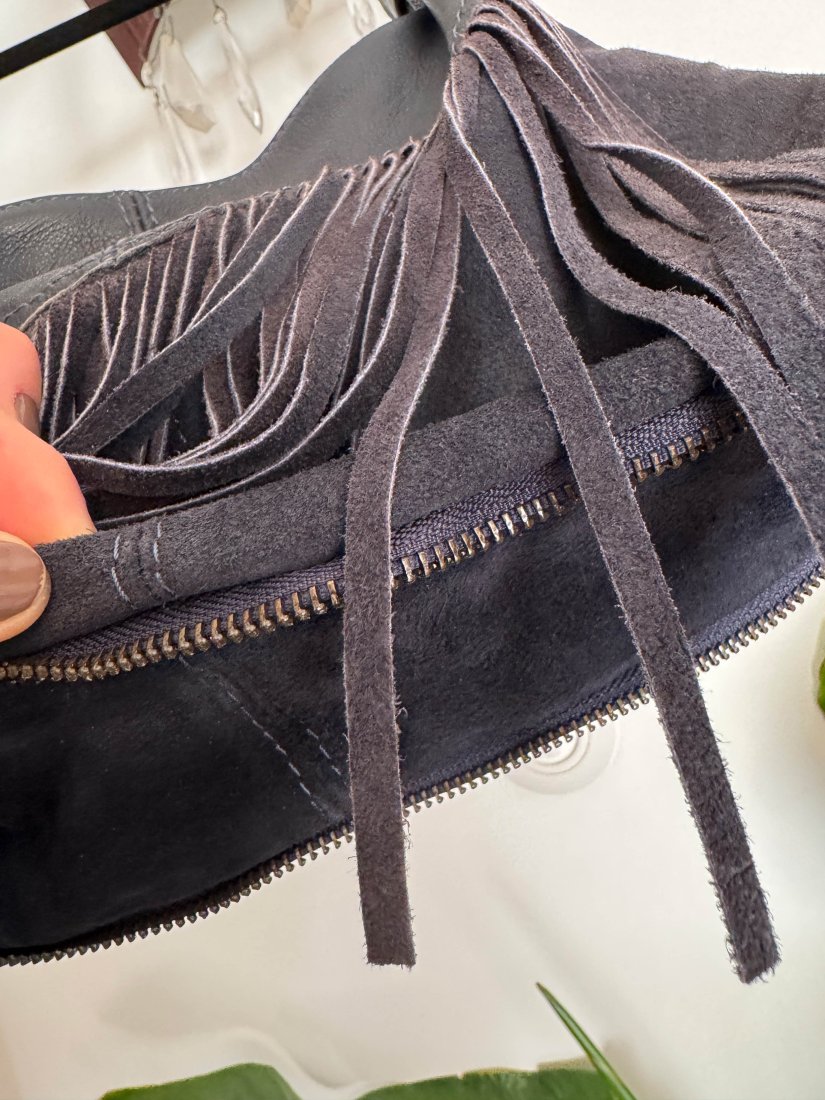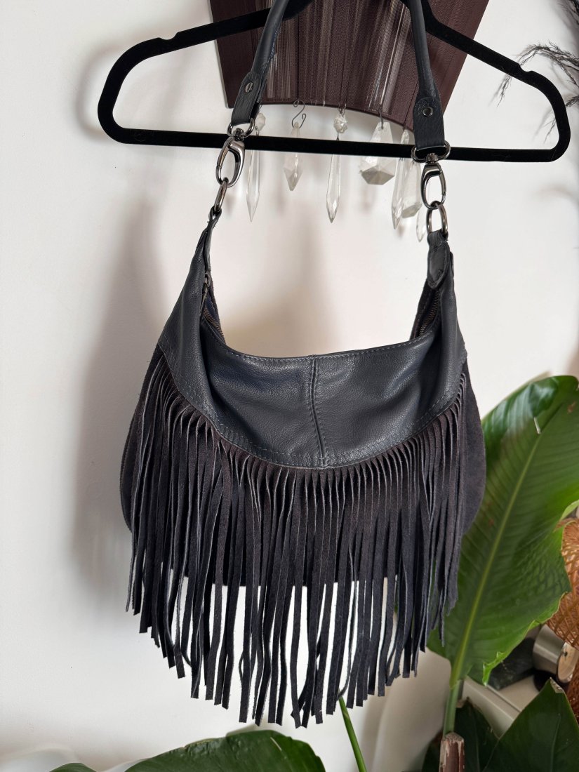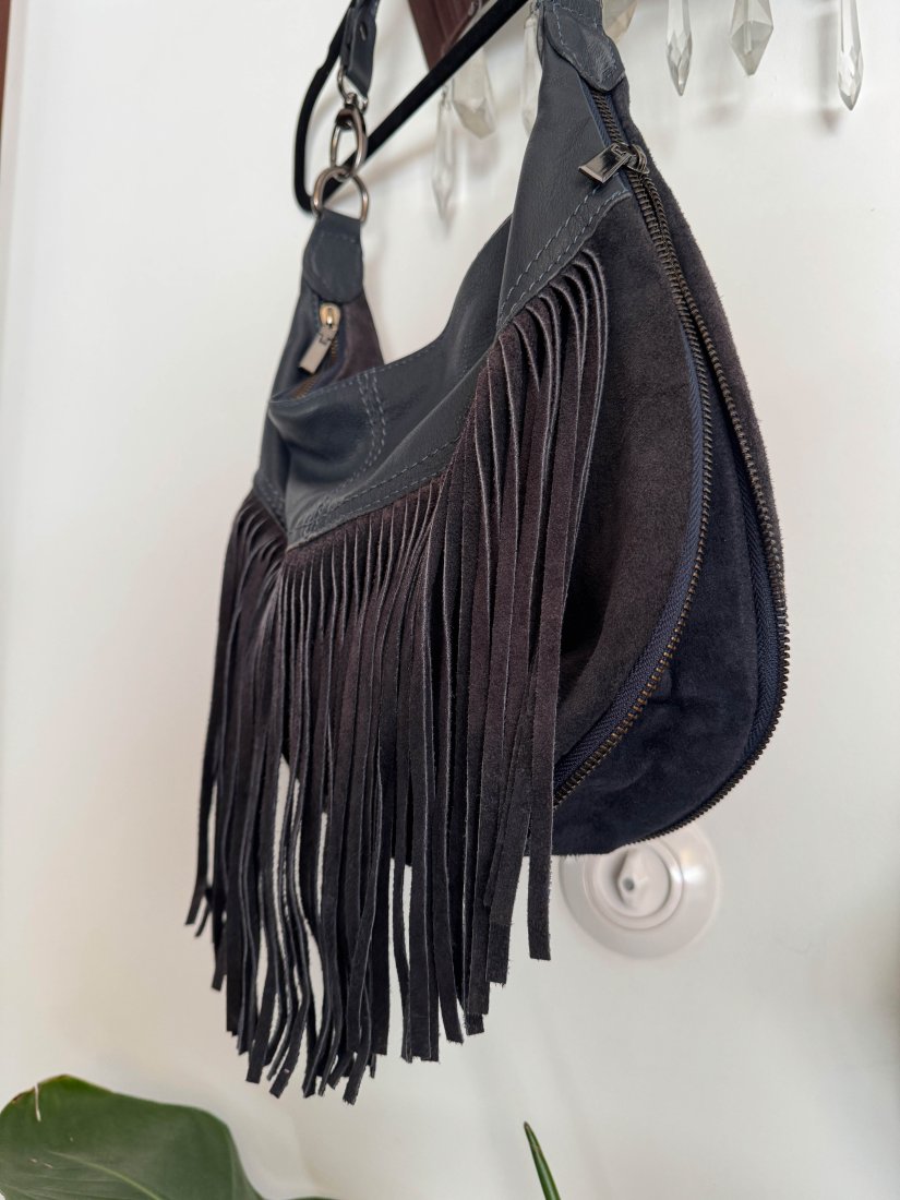 Mieszanka zamszu i skóry licowej. Zapinana na suwak. W środku kieszonka również na suwak. Odpinana rączka. Dodatkowy atut - rozpinany suwak na spodzie, co w razie potrzeby dostarcza dodatkowego miejsca. Super długie frędzle. Suwaki i sprzączki kolorze starego srebra.