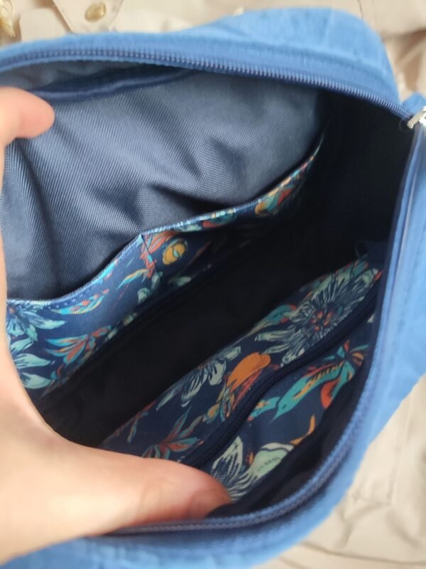 Wewnątrz podszewka wodoodporna z kieszonką na zamek i dwiema wysuwanymi.
