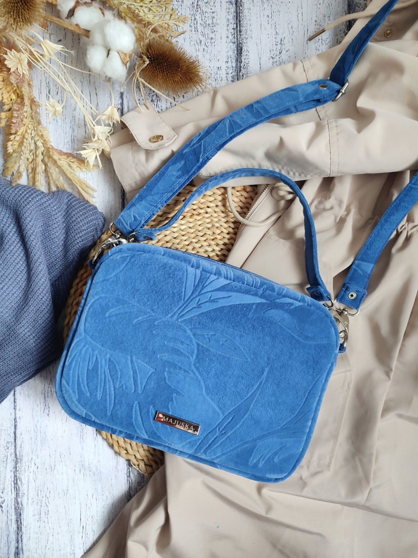 Torebka w kształcie Boxa, uszyta z tłoczonego weluru w przepięknym odcieniu zgaszonego chabru. Tłoczenie w kształcie liści.