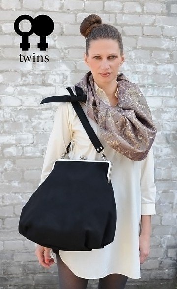 Elegancka, duża, marszczona torebka zapinana na modne metalowe zapięcie bez problemu mieści format A4 Wykonana z czarnej, tkaniny . W środku czarna podszewka i kieszonka. Torebka jest usztywniana i zaopatrzona w regulowaną rączkę do noszenia przez ramię. Wszystkie torebki tworzone są w pojedynczych egzemplarzach i zaopatrzone w metki z logo Twins. Wymiary: zapięcie 25cm, długość 50cm, szerokość w najszerszym miejscu 50cm, dł. raczki do regulacji.