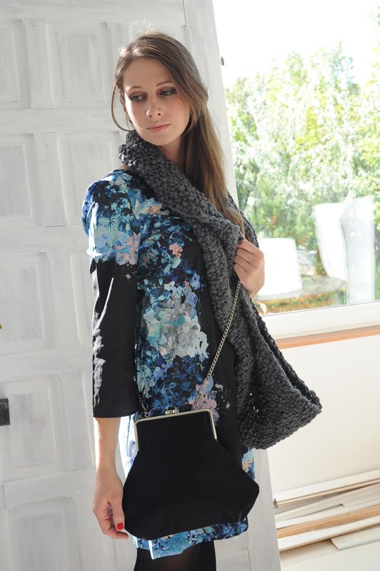 Mała, elegancka torebka zapinana na metalowe, srebrne zapięcie. Wykonana z czarnej tkaniny. W środku podszewka . Podszewka może sie różnic kolorem od prezentowanej na zdjęciu. Rączka to łańcuszek do zakładania przez głowę. Torebka jest usztywniana i