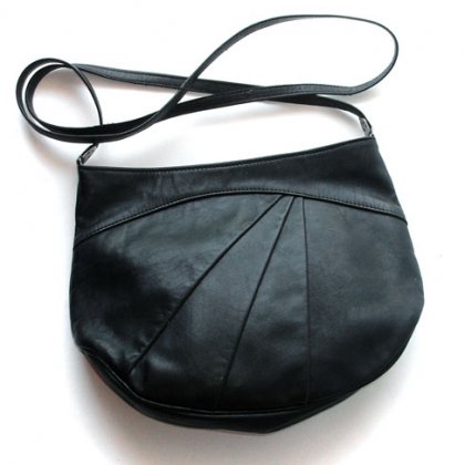 Mała torebka z czarnej skórki ekologicznej do noszenia na krzyż. W środku oliwkowa podszewka i kieszonka. Zamykana na suwak. Szer. 25 cm, wys. 19 cm, dł. paska 110 cm. Stan: używana, ale bardzo dobrze utrzymana, stan bardzo dobry.