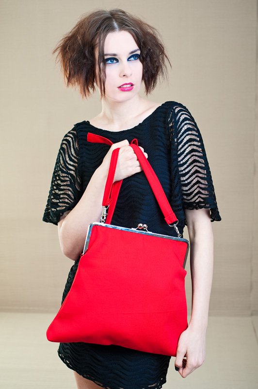 Elegancka torebka ,zapinana na duże, modne, metalowe zapięcie -mieści format A4 Wykonana z czerwonej, tkaniny . W środku podszewka i kieszonka. Podszewka może mieć inny kolor niż prezentowana na zdjęciu.Torebka jest usztywniana i zaopatrzona w regulowaną rączkę do noszenia przez ramię. Wszystkie torebki tworzone są w pojedynczych egzemplarzach i zaopatrzone w metki z logo Twins. Wymiary: zapięcie 28cm, długość 33cm, szerokość w najszerszym miejscu 38cm, dł. raczki do regulacji. . Termin realizacji zamówienia to 1-2 dni.